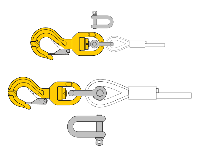 Alternatywnie możliwe jest przełożenie większej szakli (spełniającej wymagany tonaż układu) przez ucho haka, co pozwala na wykonanie połączenia sworzniem bezpośrednio do podczepianego elementu – jak pokazano na dolnej ilustracji.